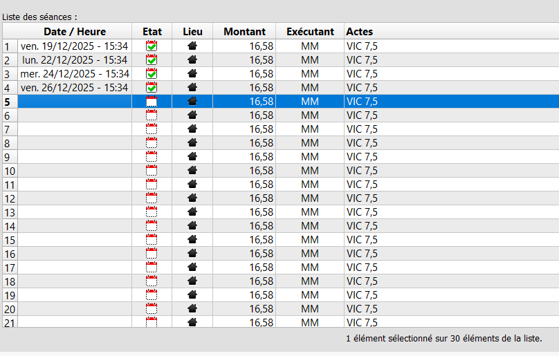 Ensuite, et pour votre première séance après le 1ᵉʳ janvier 2026, vous pourrez la planifier en double-cliquant sur la séance concernée depuis votre menu soins :