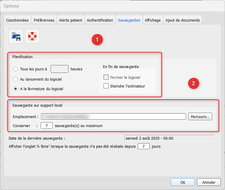 Depuis les Préférences du logiciel, onglet Sauvegardes, plusieurs paramétrages vous seront disponibles :