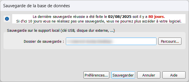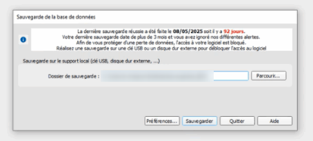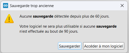 Au-delà de 90 jours sans sauvegardes, il vous sera demandé de réaliser une sauvegarde avant d’accéder à nouveau au logiciel. Ce blocage ne sera pas effectif lors des weekends et jours fériés.