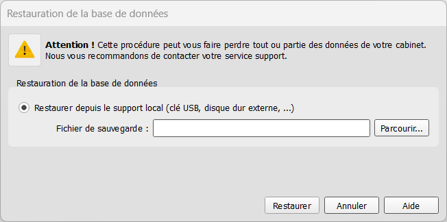 ⚠️ ATTENTION ! La restauration d’une sauvegarde remplacera les données actuellement présentes dans le logiciel par celles contenues dans la sauvegarde. Cette opération peut entraîner la perte partielle ou totale des données de votre cabinet. Nous vous recommandons vivement de contacter le service support avant toute restauration.